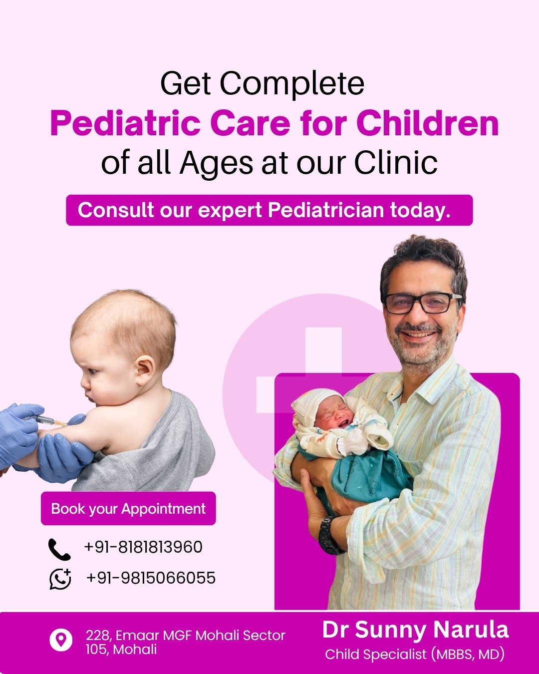 Dr.Sunny Narula is a child specialist based in Mohali, providing pediatric care including checkups, vaccinations, and treatment for children of all ages. The clinic focuses on clear consultation, child-friendly care, and practical guidance for parents. Conveniently located near Chandigarh, it supports families with accessible healthcare services.