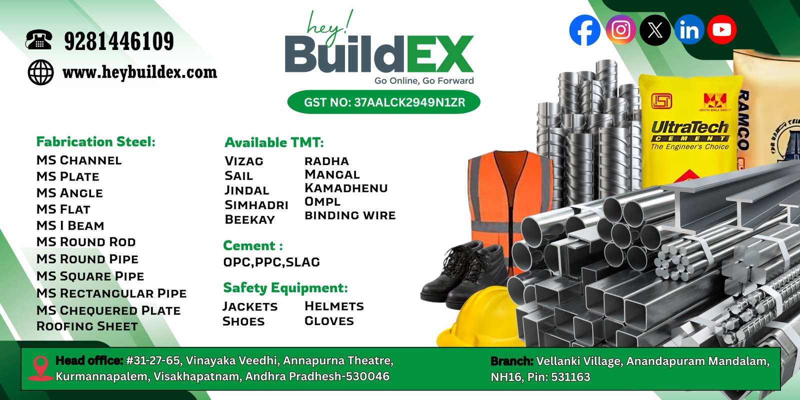 HeyBuildex is your trusted one-stop destination for high-quality construction materials, including Cement, TMT Steel, MS Pipes, Fabrication Materials, RMC, and Safety Equipment. We supply top brands with reliable service and on-time delivery to ensure every project is strong, durable, and safe. Whether you're a contractor, builder, or homeowner, build with confidence — build with HeyBuildex! ???? Call Now: +91 92814 46109 ???? Address: Vellanki Village, Anandapuram Mandalam, NH16, Pin: 531163 ???? Website: www.heybuildex.com