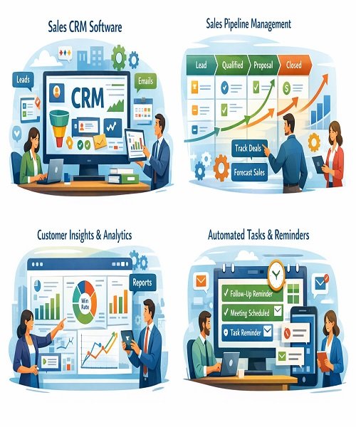 Sales CRM software is designed to help businesses manage and optimize their sales activities. It centralizes customer information, tracks leads, monitors interactions, and organizes the sales pipeline. By automating tasks like follow-ups and reporting, it improves efficiency and accuracy. Sales teams gain valuable insights through analytics and forecasting, enabling better decision-making, stronger customer relationships, higher conversion rates, and sustainable revenue growth.