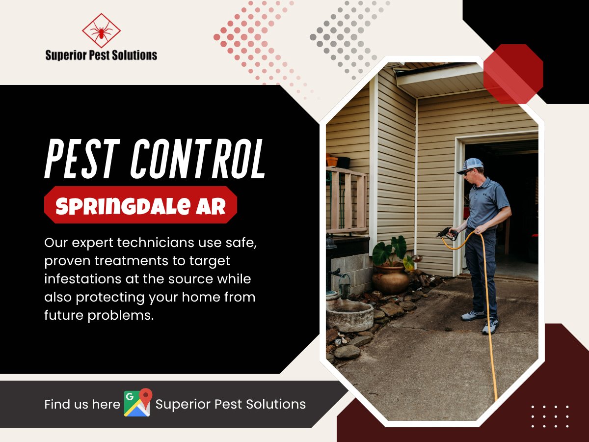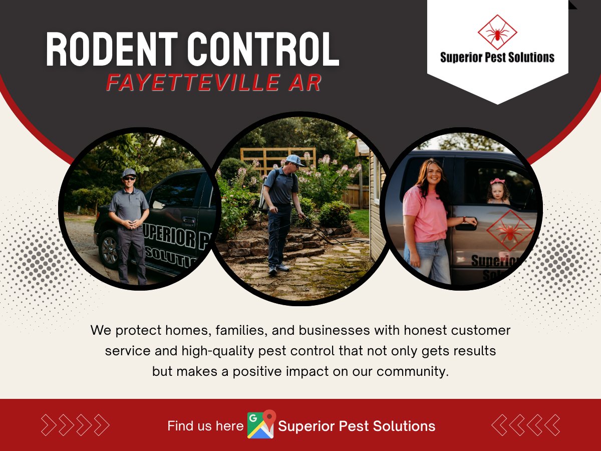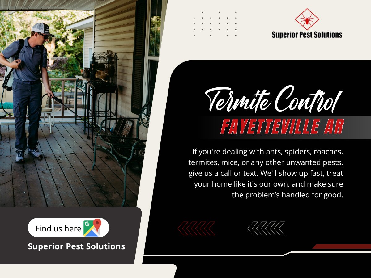 Superior Pest Solutions NWA is a service-member-owned pest control company protecting homes and businesses across Fayetteville, Bentonville, Rogers, and all of Northwest Arkansas. We provide fast, reliable pest control for ants, spiders, termites, mosquitoes, and rodents — with safe, effective treatments and integrity. Known for our community-first approach, we’re #NotJustAnotherPestControlCompany — we’re your trusted local experts in not only keeping pests out for good, but also giving back to our community through good deeds and superior service.