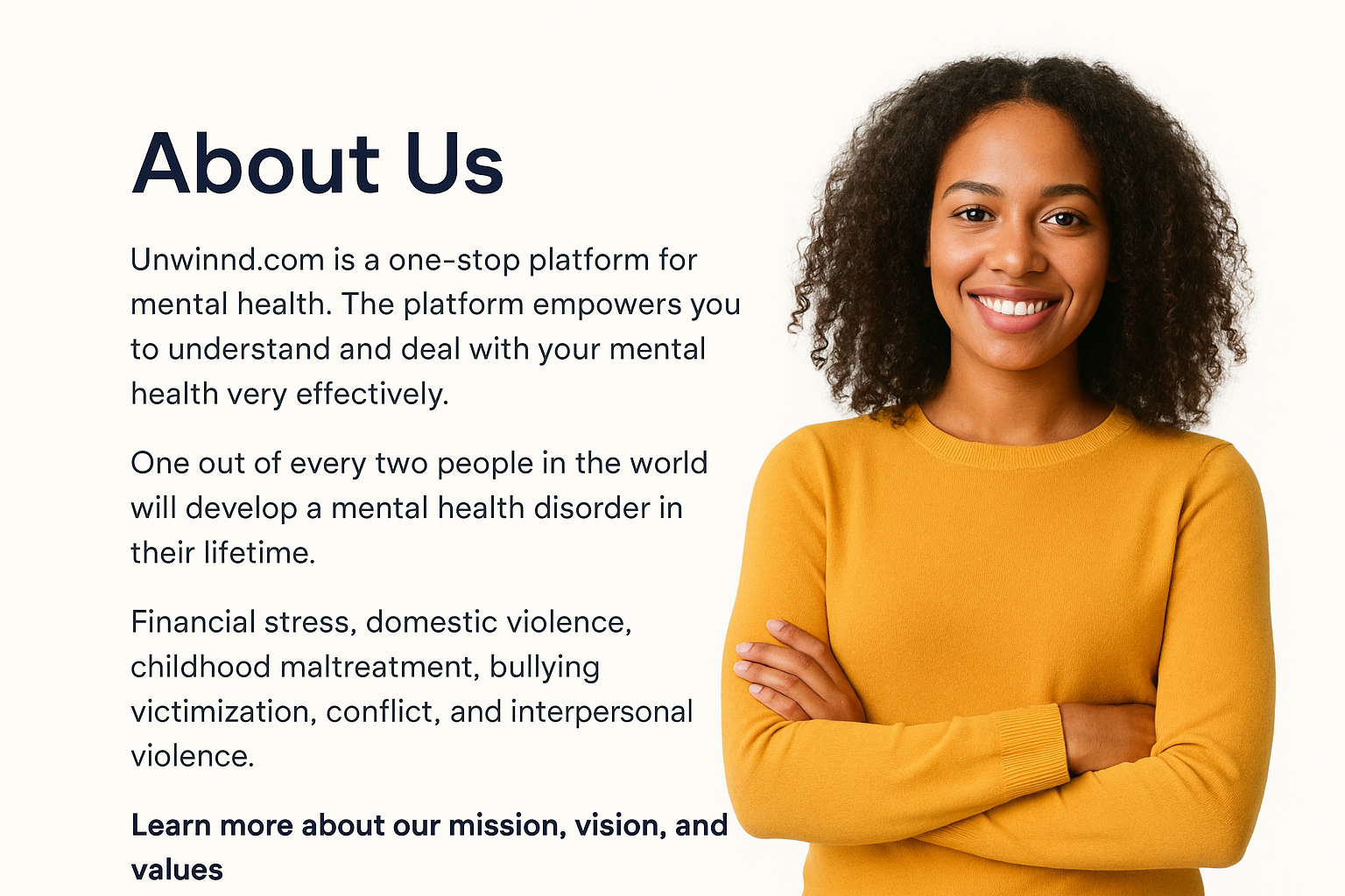 Welcome to Unwinnd.com, your trusted partner in mental health and emotional well-being. With millions of people experiencing mental health challenges daily, we recognized the urgent need for a platform that offers clarity, support, and guidance in one place. At Unwinnd, we bring together professional tools, community support, and innovative resources to help you better understand and manage your mental health. Mental health disorders can arise from many life situations—financial stress, domestic challenges, workplace conflict, or childhood trauma. By proactively addressing these factors, Unwinnd helps reduce their long-term impact. We believe that early access to the right tools and interventions can prevent much of the global burden caused by conditions such as anxiety and depression. Our mission is to provide affordable, effective, and accessible mental health solutions for everyone. Our vision is to create a community that prioritizes emotional well-being and eliminates the stigma surrounding mental health struggles.
