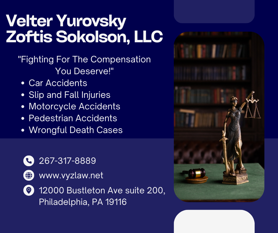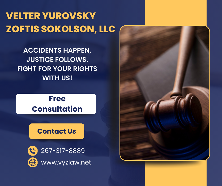 If you’ve been injured in an accident, you need a lawyer who understands both the law and the impact it has on your life. At Velter Yurovsky Zoftis Sokolson, LLC, our Philadelphia personal injury attorney provides skilled representation backed by years of experience and proven results.