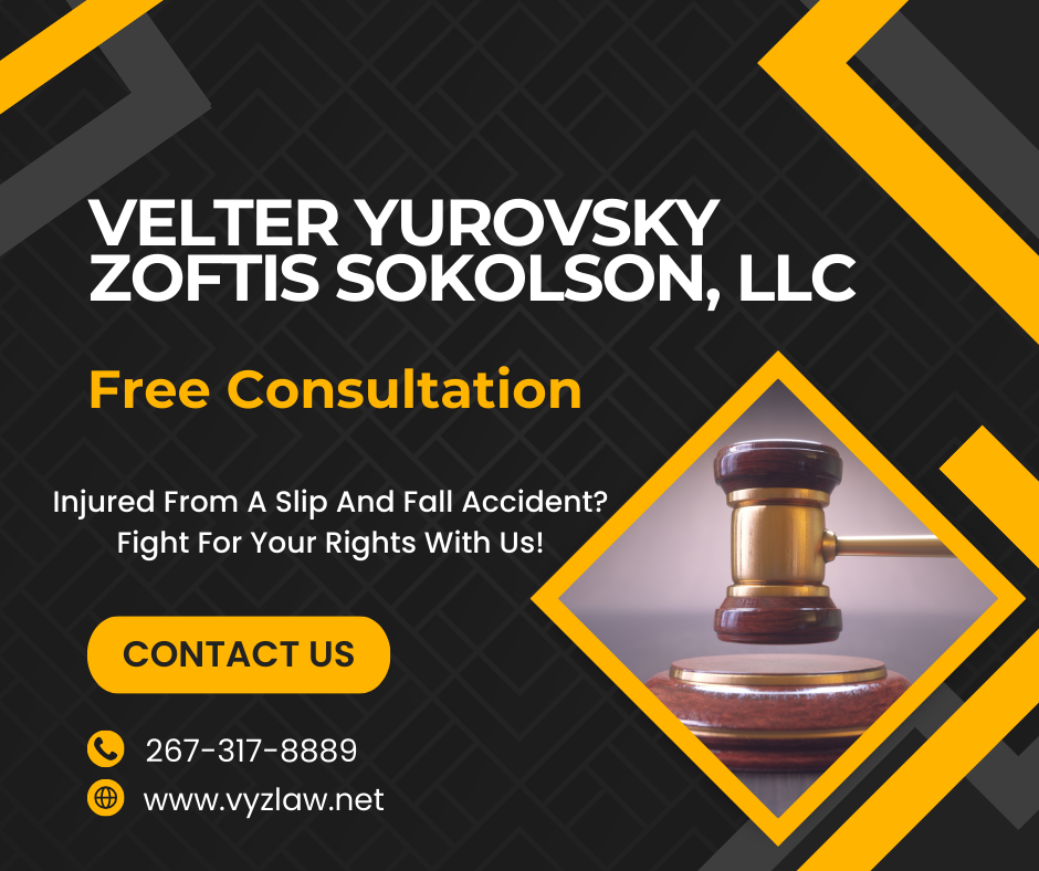 At Velter Yurovsky Zoftis Sokolson, LLC, we take pride in representing individuals who have suffered injuries due to negligence or wrongdoing. Our Philadelphia personal injury lawyer combines knowledge, experience, and compassion to deliver outstanding results for our clients. Every personal injury case deserves individualized attention. We take the time to understand your story, evaluate your damages, and pursue the justice you deserve through negotiation or litigation. We are relentless in our commitment to achieving fair outcomes for every client. With us on your side, you can rest assured that your case is in capable and caring hands.