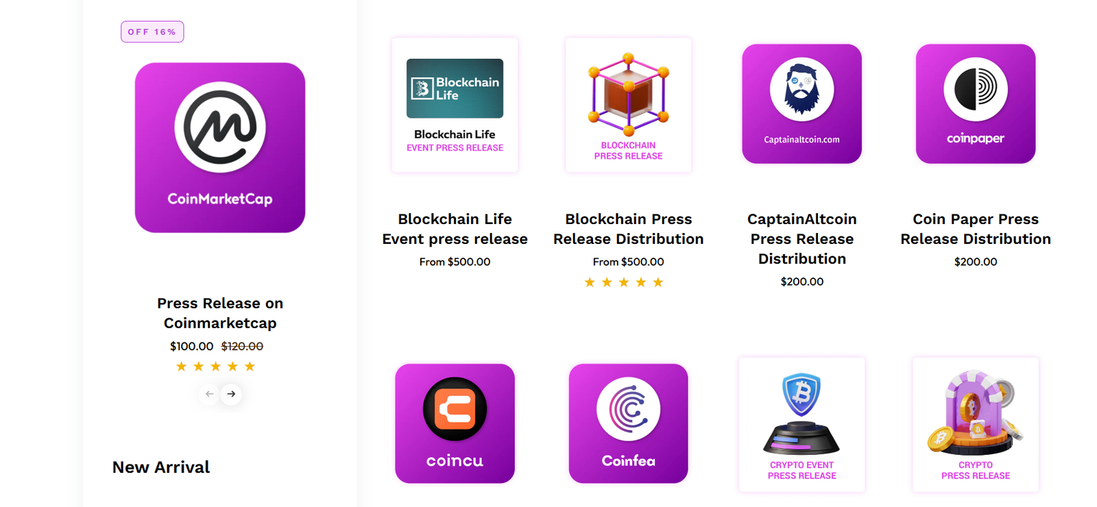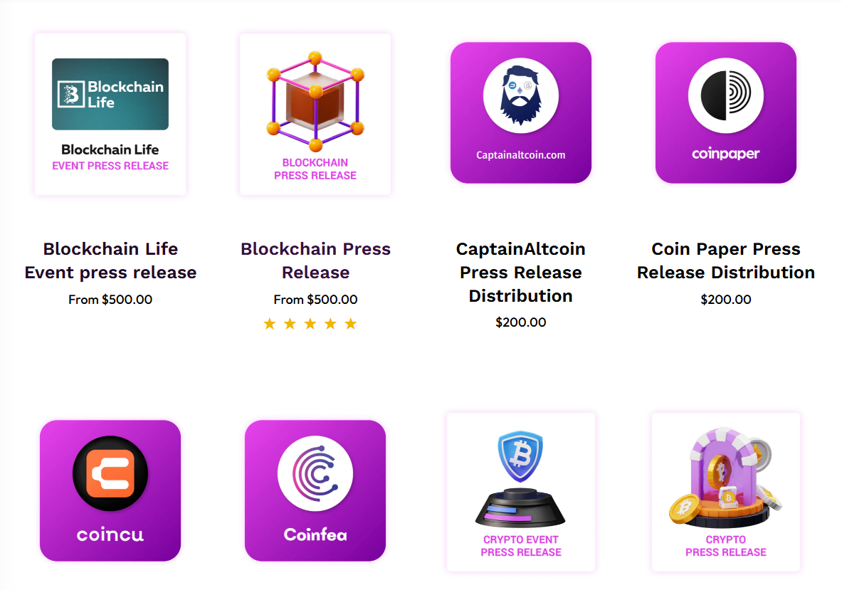 Basic at $500: Get your story in front of over 113+ millions of blockchain enthusiasts every month with our Basic Package. We'll help you make a splash in the blockchain world by featuring your blockchain press release on big-name sites like NewsBTC, CoinMarketCap, and TechBullion. Standard at $1000: Boost your blockchain PR with our Standard Package! Get featured on Binance Feeds, Benzinga, Digital Journal, plus all the perks from our Basic deal. Reach a whopping 191+ millions of monthly potential reach and make waves in the blockchain world. Ready to turn heads? Let's get your story out there and watch it spread like wildfire! Elite at $2000: Dominate the blockchain scene with our Elite Blockchain PR Distribution! Your press release will rock Zycrypto, CoinMarketCap, The Bitcoin Daily, plus all Standard package perks. Blast your Blockchain Press Release to 200+ millions of monthly audience. Ready to be the hottest talk in blockchain town? Let's make your message go viral! Supreme at $3000: Ready to rule the blockchain world? Our Supreme Blockchain Press Release Distribution package is your secret weapon to increase your online visibility! We'll blast your press release across Binance Feeds, Bitcoinist, coingape, and 20+ top Media Publications. Plus, you get all the Elite perks! Your Blockchain Press Release will reach a staggering 212+ millions projected audience size monthly.